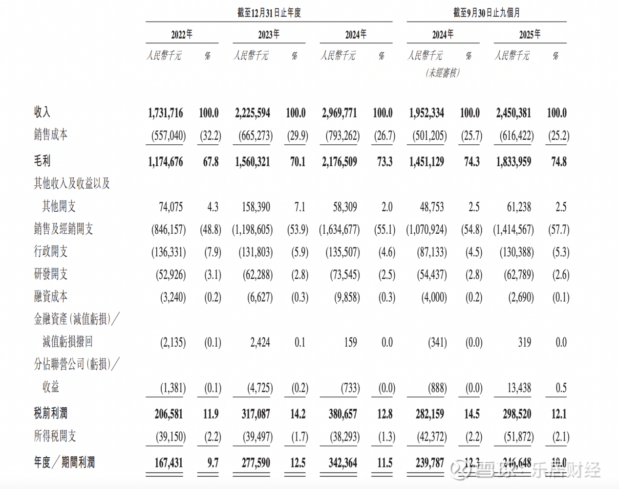 2025年前三季度,丸美生物收入24.5亿元,同比增长25.51%;期间利润为2.47亿元,同比增长2.86%;毛利率为74.8%,上年同期为74.3%。