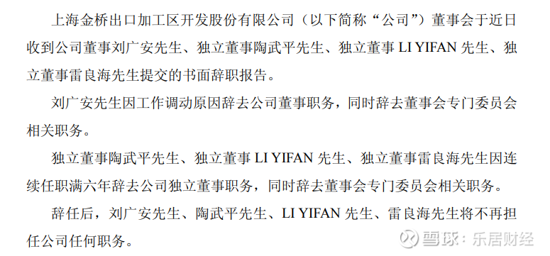 同日,浦东金桥公告,董事会于近日收到公司董事刘广安、独立董事陶武平、独立董事 LI YIFAN、独立董事雷良海提交的书面辞职报告。其中,刘广安因工作调动原因辞去公司董事职务,同时辞去董事会专门委员会相关职务。独立董事陶武平、独立董事 LI YIFAN、独立董事雷良海因连续任职满六年辞去公司独立董事职务,同时辞去董事会专门委员会相关职务。辞任后,上述4人将不再担任公司任何职务。