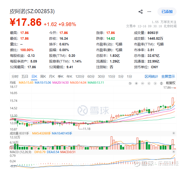 乐居财经 李兰12月16日,皮阿诺(002853.SZ)复牌涨停。截至9:30,其股价报17.86元/股,总市值为32.67亿元。