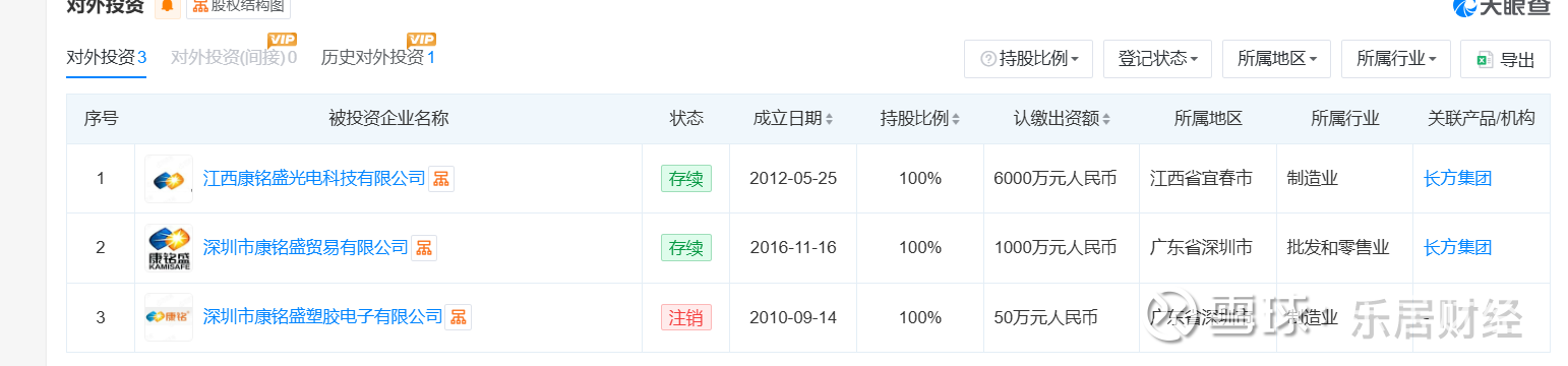 天眼查显示,长方集团康铭盛(深圳)科技有限公司(以下简称“康铭盛”)成立于2004年3月,注册资本10747.6万元,法定代表人吴涛祥,经营范围含新能源、新材料、塑胶制品、五金制品、电器、电子产品、室内外照明产品等。该公司对外有2家投资企业。