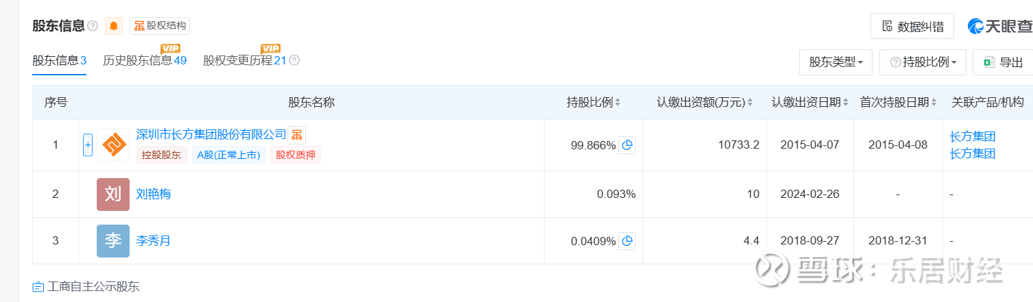该公司由深圳市长方集团股份有限公司持股99.866%、刘艳梅持股0.093%、李秀月持股0.0409%。