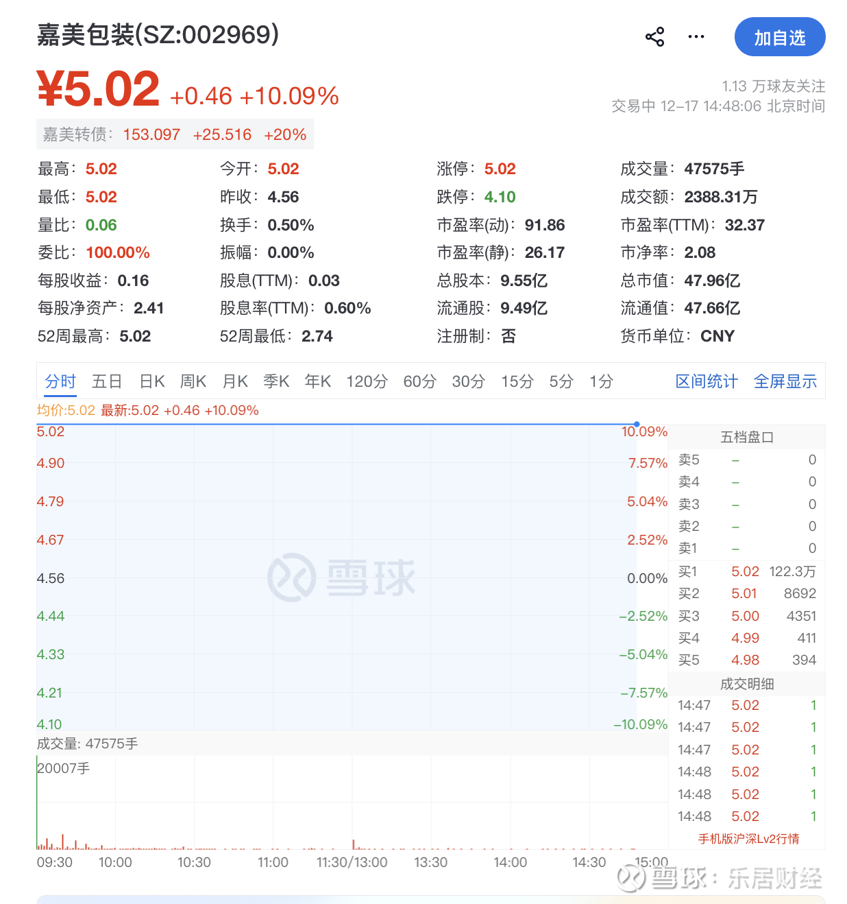 瑞财经 刘治颖 12月17日,嘉美包装(002969.SZ)复牌后一字涨停,股价报5.02元/股,总市值47.96亿元。此前,公司公告筹划控制权变更事项,于12月10日起停牌