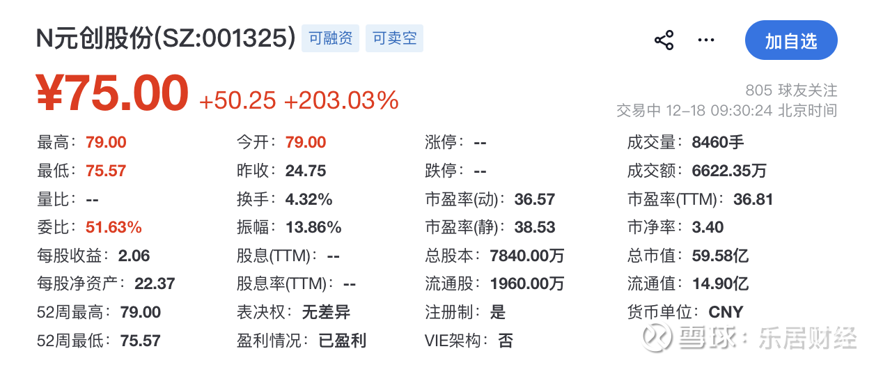 乐居财经 刘治颖12月18日,N元创股份(001325.SZ)在深交所主板挂牌上市,保荐机构为国泰海通,开盘涨203.03%,总市值59.58亿元。