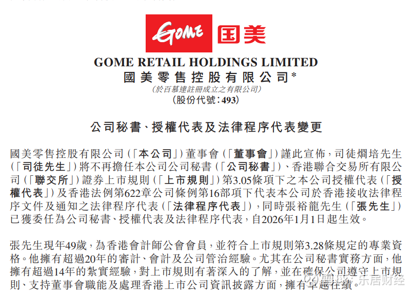 同时,国美零售宣布,张裕龙已获委任为公司秘书、授权代表及法律程序代表,自2026年1月1日起生效。