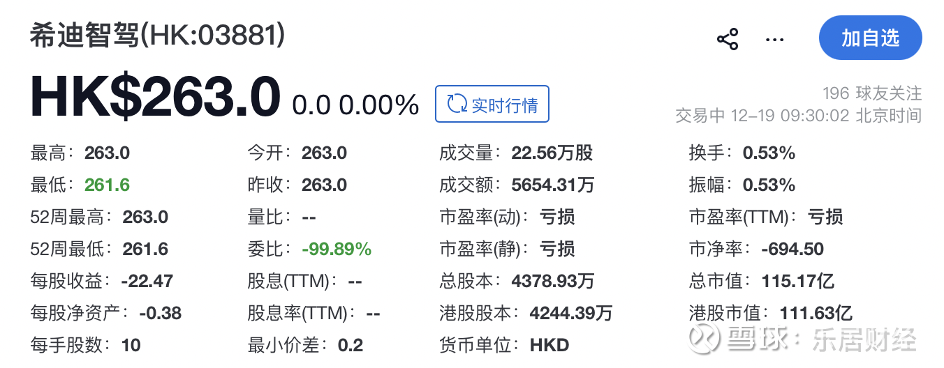 乐居财经 吴文婷 12月19日,希迪智驾(03881.HK)在港交所挂牌上市,联席保荐人为中金公司、中信建投国际、平安证券(香港)。其股价平开报263港元,总市值约115.17亿港元。