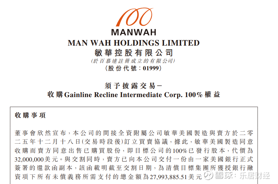 公告显示,2025 年 12 月 18 日交易时段后,敏华控股间接全资附属公司敏华美国制造与卖方 Gainline Recline Holdings, LLC 订立买卖协议。敏华美国制造同意收购,卖方同意出售目标公司 Gainline Recline Intermediate Corp. 100%已发行股本,即已购买股份,代价为 3200万美元。