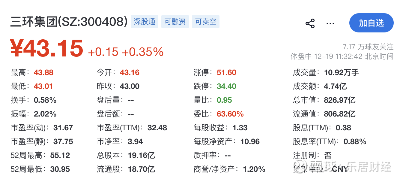 截至发稿时,三环集团A股报43.15元,涨0.35%,总市值约826.97亿元。