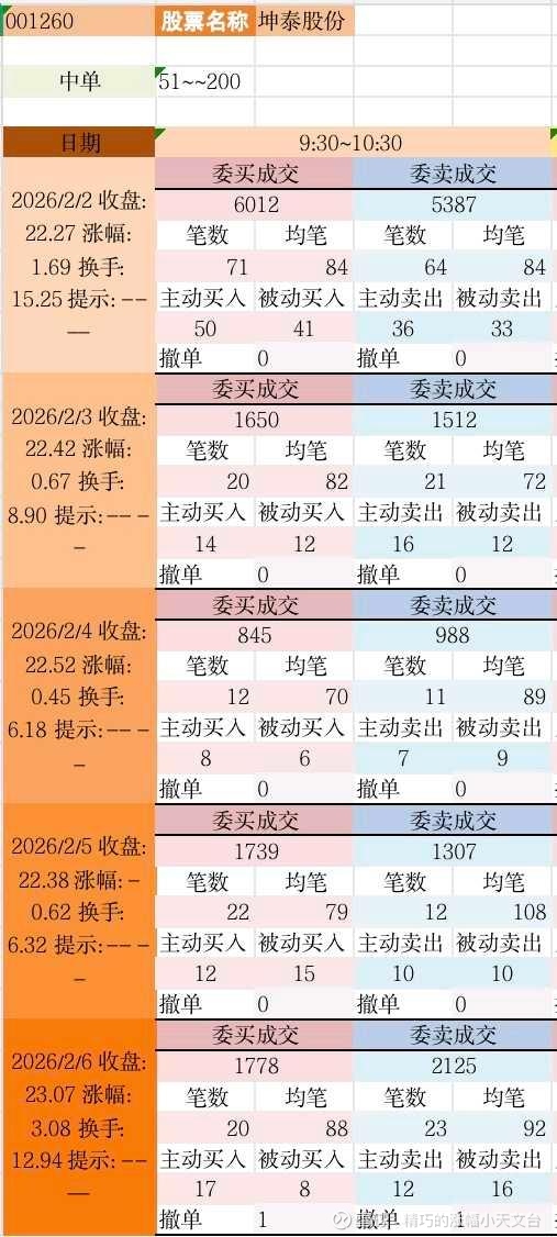 大家好,我是专注于小盘股盘口细节的跟踪者。今天继续拆解坤泰股份的中单(51~200手)成交数据,透过委托单的细节,看看资金在节后的最新动向。$坤泰股份(SZ001260)$