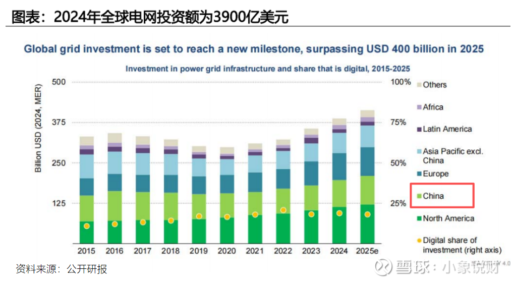 2024年,全球电网投资创下3900亿美元新高,国内电网建设额同期达到6083亿元,在全球电网投资中占据主导地位。
