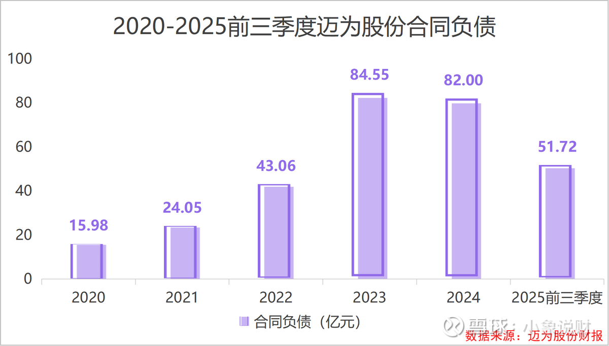 公司的合同负债金额也随之增加。2024年,迈为股份合同负债金额达到82.00亿元,截至2025年前三季度,公司合同负债金额还有51.72亿元。