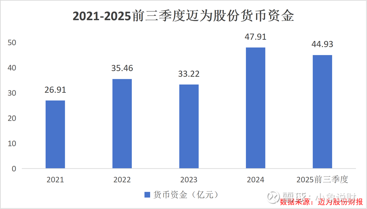先看货币资金,截至2025年第三季度,迈为股份的货币资金金额为44.93亿元,略低于此次投资总额。