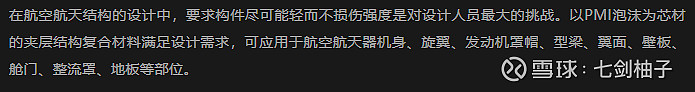 在航空航天结构的设计中,要求构件尽可能轻而不损伤强度是对设计人员最大的挑战。以PMI泡沫为芯材的夹层结构复合材料满足设计需求,可应用于航空航天器机身、旋翼、发动机罩帽、型梁、翼面、壁板、舱门、整流罩、地板等部位。