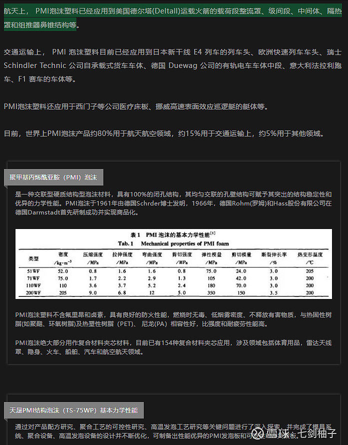 航天上, PMI泡沫塑料已经应用到美国德尔塔(Deltall)运载火箭的载荷段整流罩、级间段、中间体、隔热罩和组推器鼻锥结构等。