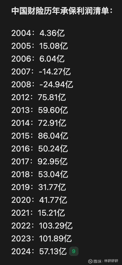 让 AI 帮我翻看了一下历年的承保利润,绝大部分都是正收益的,而且仅十几年都是正收益,只是收益略有波动罢了,唯二亏损的那两年,一个是部分保险公司为了抢占市场,恶性超低价出售保险;另一个是08年非常严重的自然灾害,导致财险赔付金额巨大,造成了亏损,但我理解这些都不是可持续的,只能说是非常罕见的意外,所以不在我们的考虑范围内
