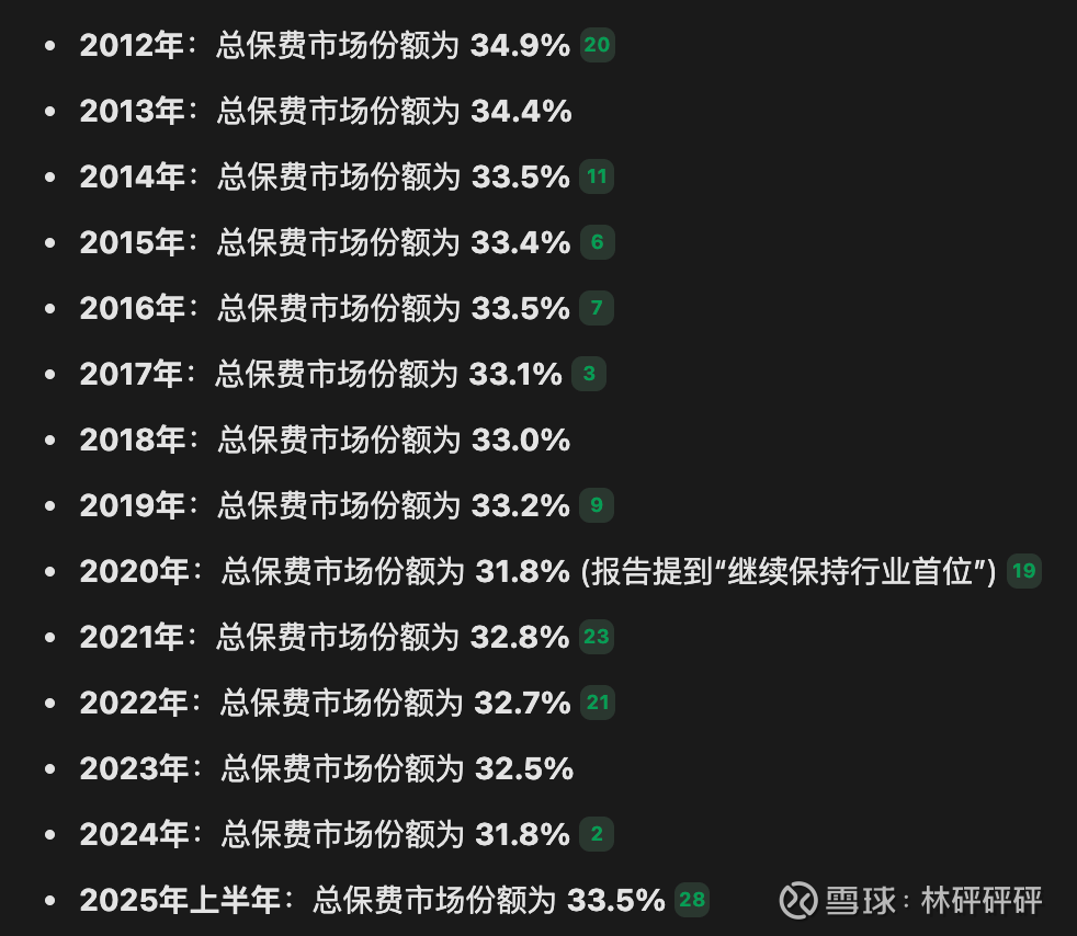 最重要的是,中国财险的车险业务市场占有率常年维持在 30% ~ 35% 左右,属于是龙头。市场占有率虽然不算是什么绝对的护城河和核心竞争力,但是它已经用十几年的时间证明了,它就是有这样的能力保持自己的市占率,是运营能力也好,是垄断也好,是公司长期运行下去建立起来的品牌信任也罢,总之,它就是有这样的能力