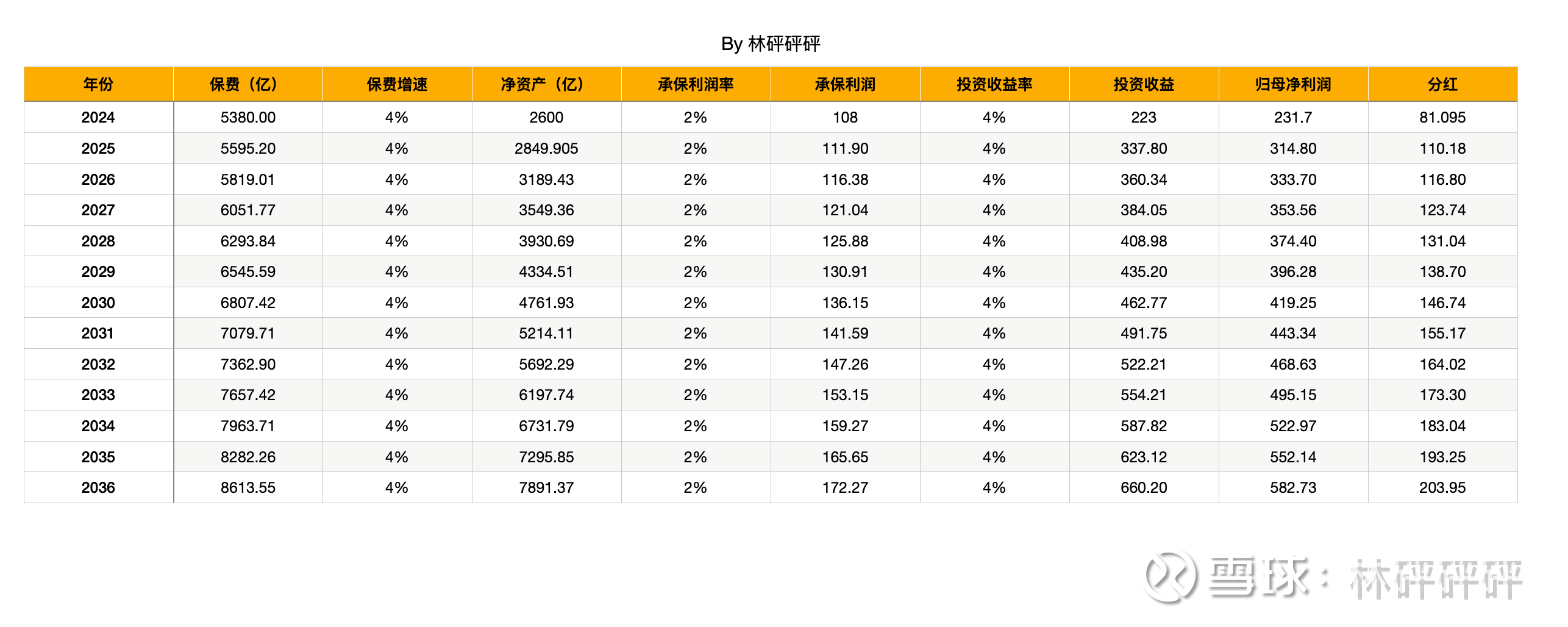 我们就悲观点取下限 3.5%,即公司只需要每年投资实现 3.5% 的收益率,就能带来净资产 10% 的增长,那么在高利率时代,公司超配国债;在低利率时代,加大对高股息资产的配置;实现每年 3.5% 的收益率不难吧?这还仅仅是悲观估值
