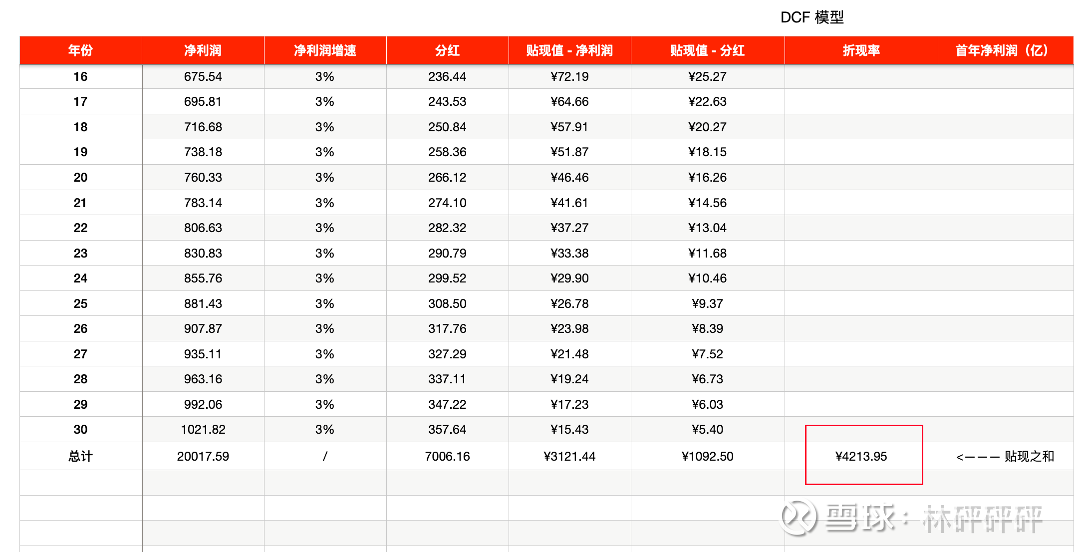 然后再根据 DCF 进行推算公司的内在价值,折现率取 15%,永续利润增速取 3%则: