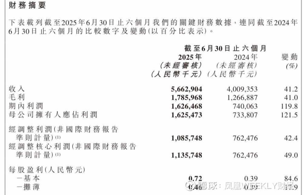 截至2025年6月30日,古茗实现总收入56.63亿元(人民币,下同),同比增长41.2%;毛利为17.86亿元,同比增长41%。期内利润为16.26亿元,较去年同期的7.4亿元实现翻倍增长,母公司拥有人应占利润同比跃升121.51%至16.25亿元,每股基本盈利0.72元。