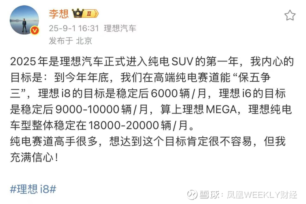 2025年是理想汽车正式进入纯电SUV赛道的第一年。在李想的预期中,到今年底,理想汽车在高端纯电赛道能“保五争三”。“理想i8的目标是稳定后6000辆/月,理想i6的目标是稳定后9000-10000辆/月。算上理想MEGA,理想纯电车型整体目标预计将稳定在每月1.8万-2万辆。”