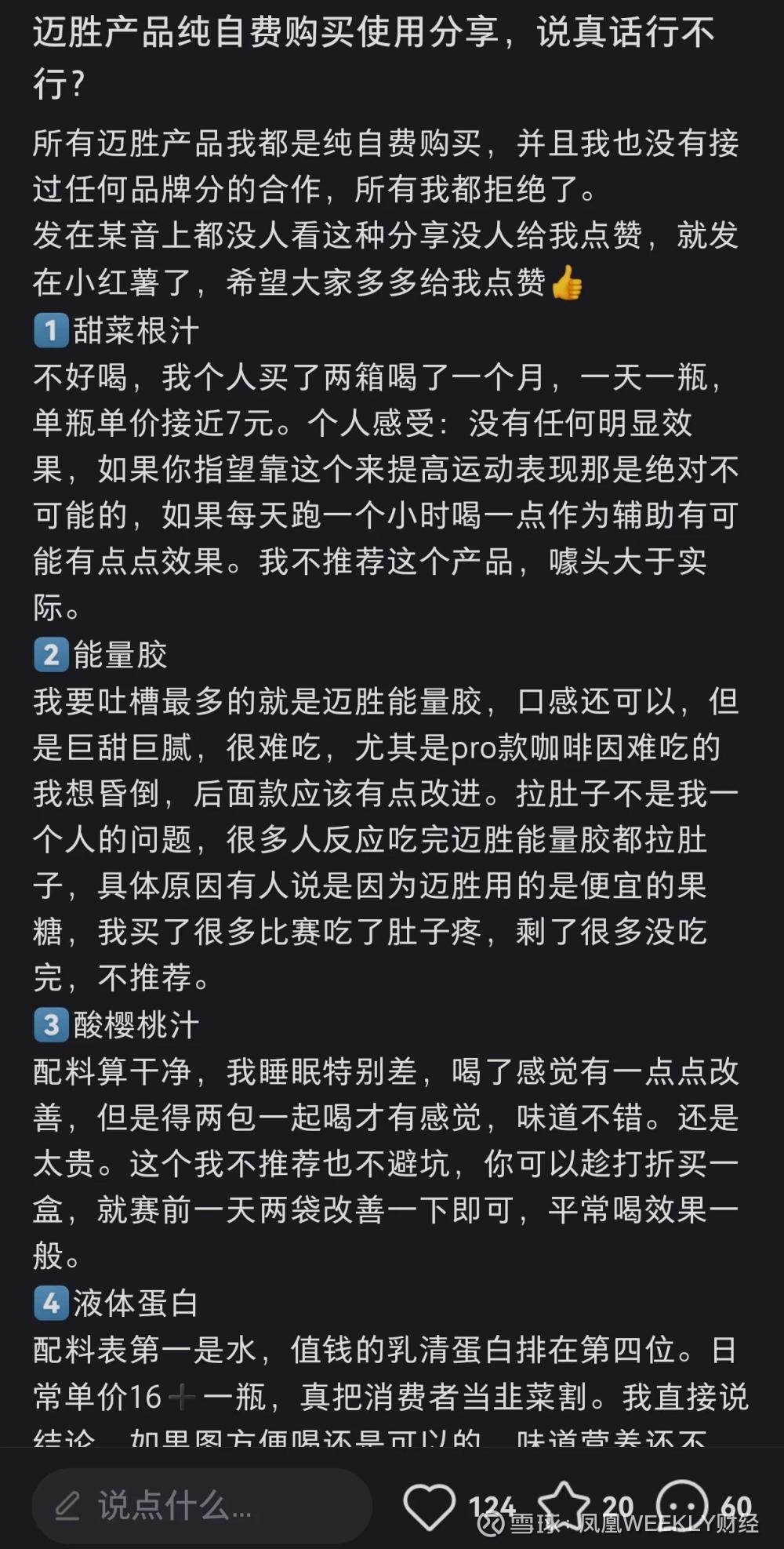 社交平台上,也有部分消费者吐槽迈胜甜菜根液效果不明显,噱头大于实际;能量胶口感还行,但味道太甜;酸樱桃液味道不错,但只有赛前一天两袋可改善睡眠情况,平时喝效果一般......