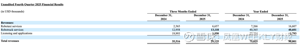 2025年总收入9000.1万美元,较2024年增长20.0%。因乘客车费收入在第四季度同比增长超500%,全年增幅接近400%,2025年第四季度,Robotaxi业务收入同比增长159.5%至665.7万美元,全年该业务收入同比增长128.7%至1660.7万美元。前述数字来源于自动驾驶明星企业小马智行(PONY. NASDAQ)日前发布的2025年财报。