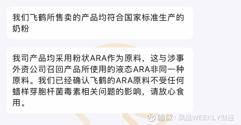 飞鹤客服表示,飞鹤所售产品均符合国家标准生产,可通过罐身追溯码查询产品真伪与相关信息。针对消费者关心的原料安全问题,客服补充说明,飞鹤产品采用粉状ARA作为原料,与此前涉事外资品牌召回产品所使用的液态ARA并非同一种原料,原料不受相关毒素问题影响。(注:今年1月,雀巢等外资品牌因供应商ARA(花生四烯酸)油脂原料疑似受蜡样芽孢杆菌污染,发布预防性召回公告,涉及跨境电商及部分海外渠道特定批次产品。)