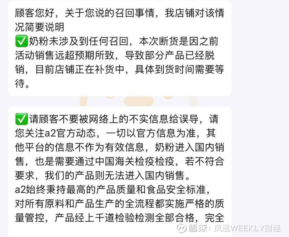 除伊利外,记者以消费者身份,先后咨询飞鹤、a2至初京东自营旗舰店客服,两家品牌官方也均对网传召回、下架说法予以否认。