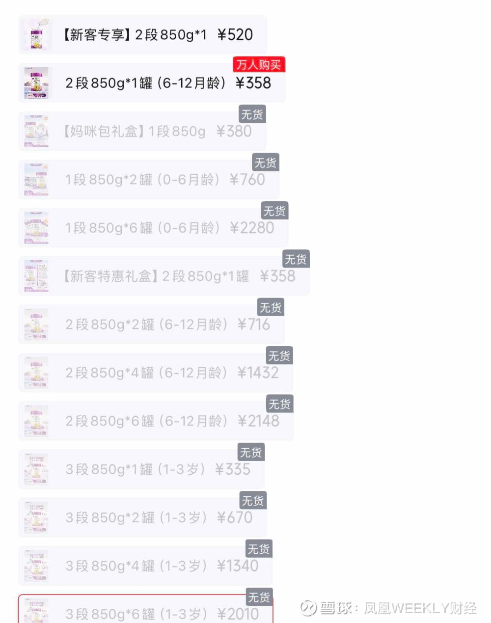 记者查验京东自营平台在售状态发现,伊利、飞鹤旗下全系列婴幼儿配方奶粉各段数、多规格均可正常下单。a2至初平台店铺内,仅2段850g单罐等少数规格显示有货,1段多规格、2段多罐组合装、礼盒装等多款产品均标注“无货”状态。