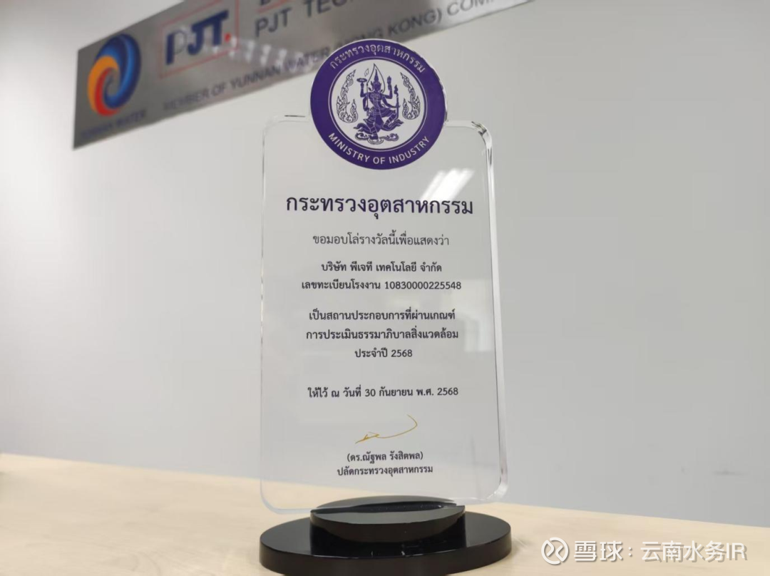 近日,云南水务下属海外大区PJT科技有限公司荣获泰国工业部颁发的“2025年度环境治理优秀奖”,成为普吉岛地区唯一获此殊荣的企业,充分体现了PJT公司在环境保护与绿色运营方面取得的突出成效。