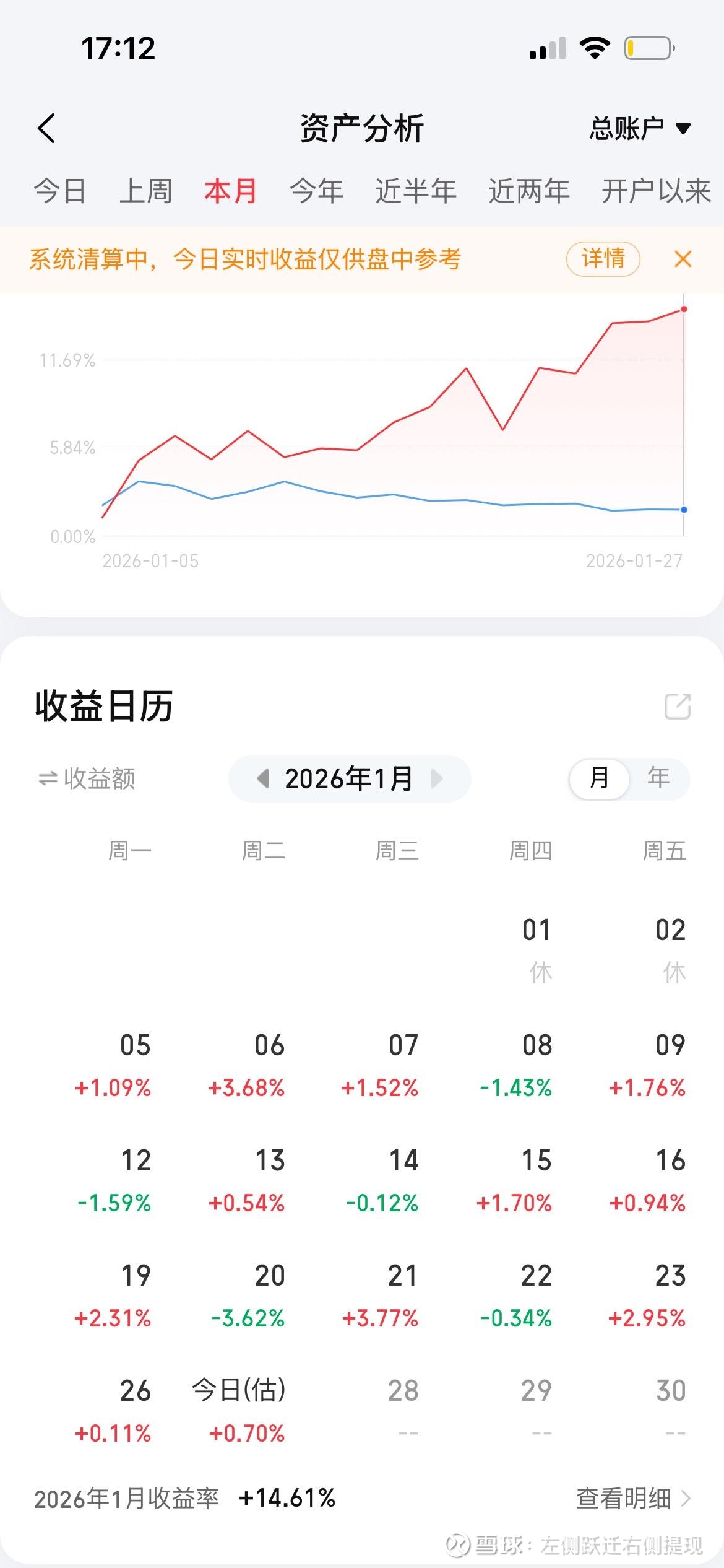 今日整体盈利0.70%,1月份盈利14.61%,净值年内新高。