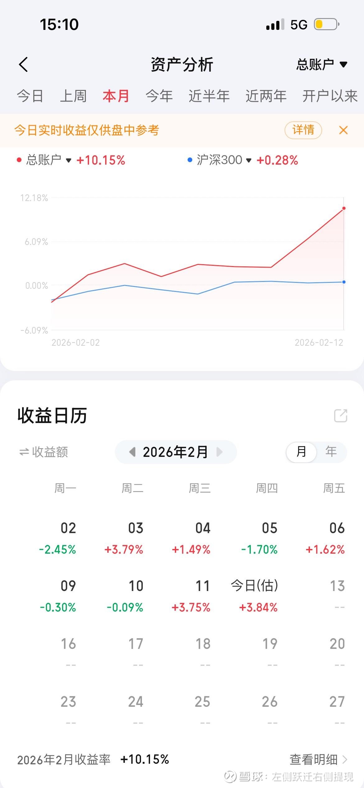 今日整体盈利3.84%,2月份盈利10.15%,2026盈利19.18%,净值继续创年内新高。虽然今天是最后的出金日,但我依然没有操作。