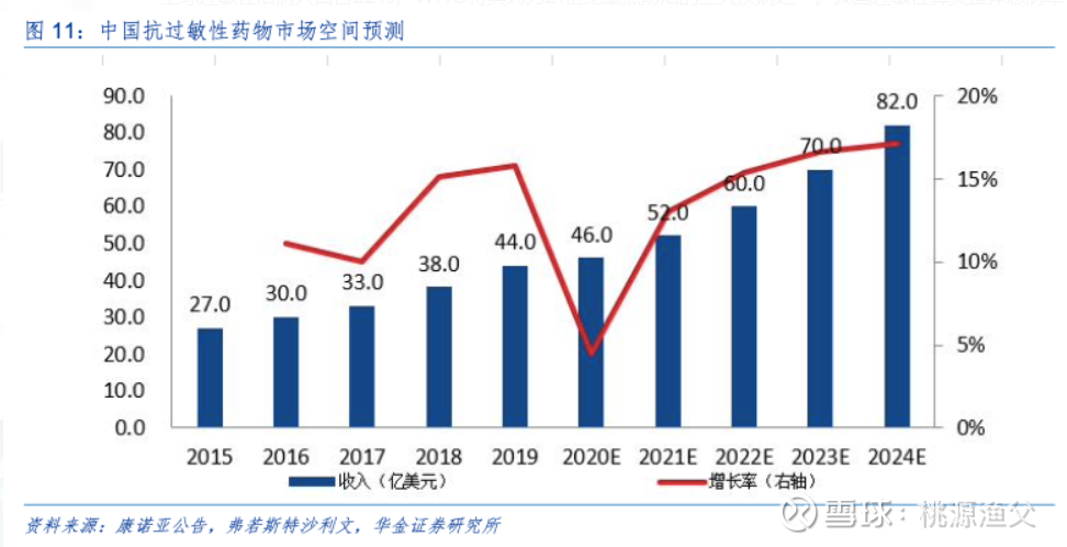 另,据预测,我国过敏性药物市场2019年达44亿美元,预计2024年增长至82亿美元,5年复合增速13.2%。