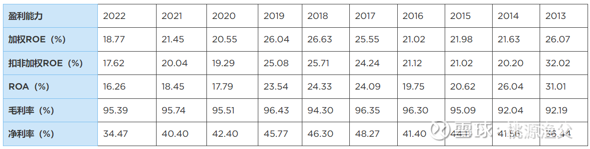 公司资产负债率极低,2022年年报为7.77%,净利率为40%左右,ROE常年在20%以上。