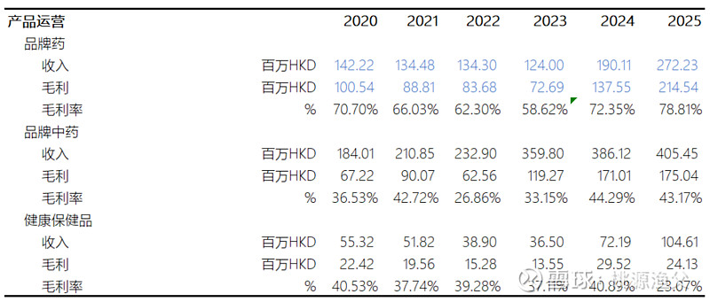 品牌中药 -- 制造及分销品牌中药,核心产品包括 保济丸、飞鹰活络油、唐太宗活络油及2025年新增了天喜堂的天喜丸等。这类业务收入占比最大,且健倍苗苗拥有历史悠久的品牌,过去5年平均毛利率40%左右。