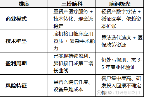以下从业务模式、核心技术、财务表现、市场地位及未来潜力等维度,对三博脑科与脑洞极光进行深度对比: