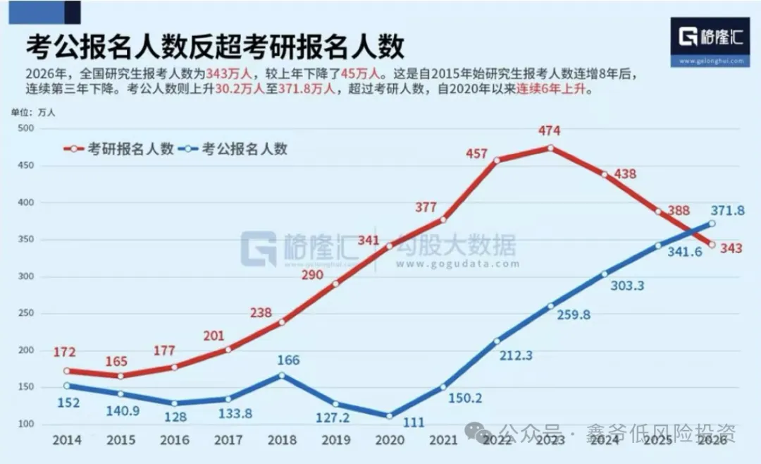 报名明年考公的人数首次超过了报名考研的人数。考公的人数从2020年以来从111万增长到了371万,涨了两倍还多,妥妥的大牛市。