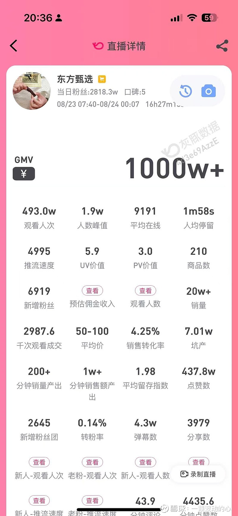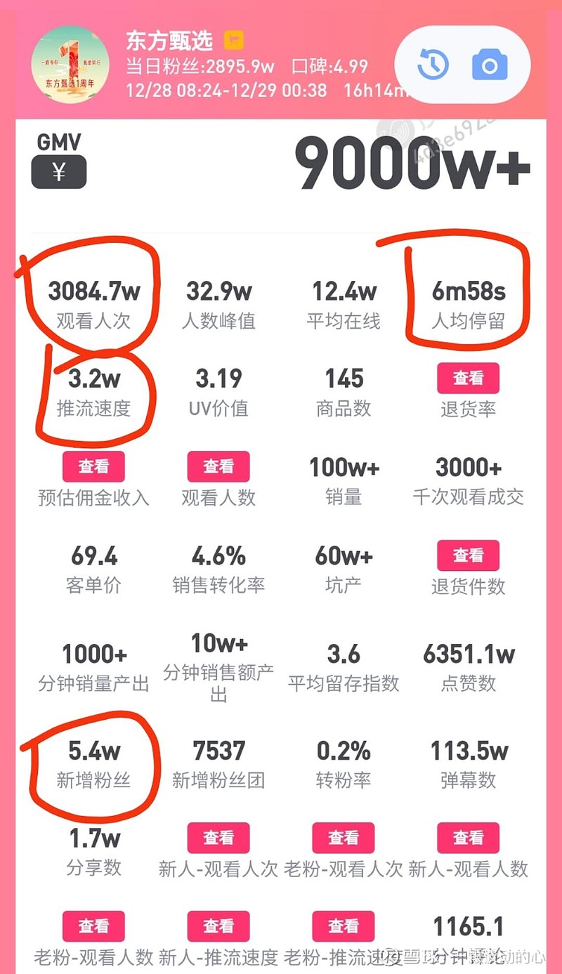 图一是东方甄选一周年,大号观看人次3084万次,人均停留6分58秒,gmv9000W+;
