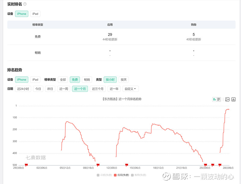 图四是2023年7月26日,因为直播间露出二维码被封三天,app下载量爆发,总榜29,购物第5。新粉们不用看到最近下载购物排名20多就以为创历史了,其实不然。