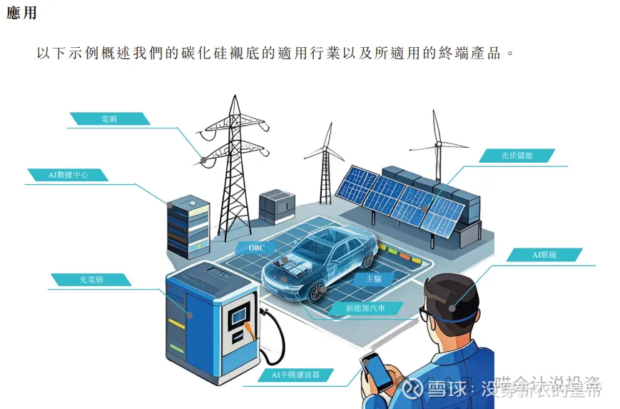 其量产碳化硅衬底的尺寸已从2英寸迭代升级至8英寸,公司在2024年推出了业内首款12英寸碳化硅衬底。碳化硅衬底可广泛应用于电动汽车、AI数据中心、光伏系统、AI眼镜、 轨道交通 、电网、家电及先进通信基站等领域。