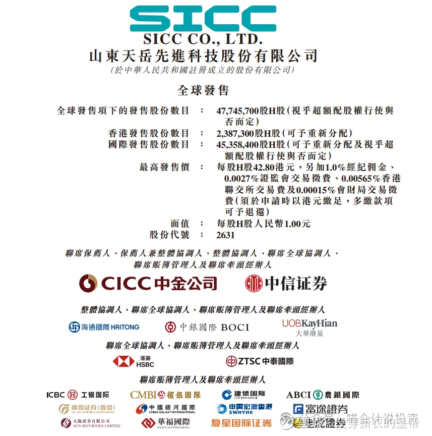 天岳先进(02631.HK)于2025年8月11日启动港股招股,招股期为8月11日至8月14日,预计8月15日定价,8月19日在香港联交所主板挂牌上市,由中国国际金融香港证券有限公司、中信证券(香港)有限公司担任联席保荐人。