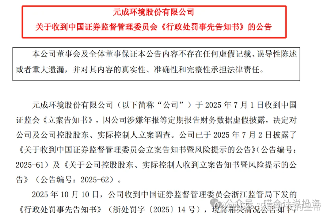 据中国证监会10月10日晚间消息,近日,证监会对上交所主板上市公司元成环境股份有限公司(简称*ST元成,603388.SH)涉嫌定期报告等财务数据存在虚假记载作出行政处罚事先告知。