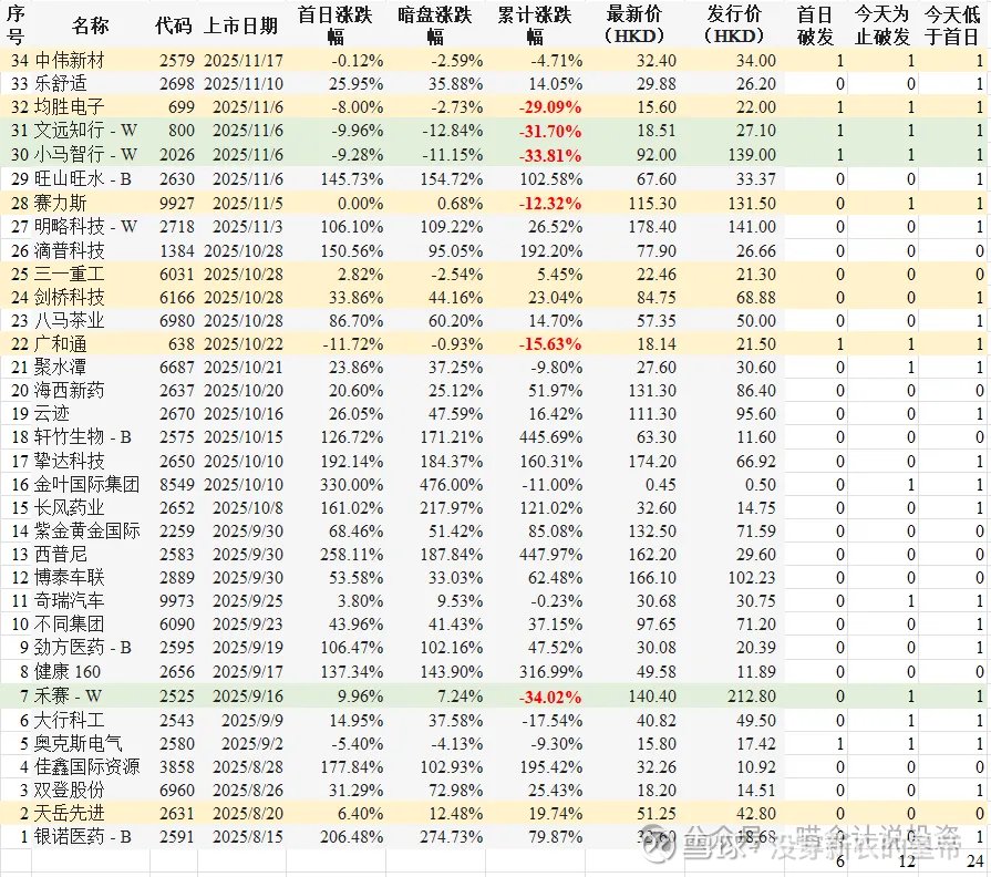 824新规之后,一共上了34家(不包括正在申购的创新实业),其中三家纳斯达克+港股二婚,7家A+H二婚,一家GEM。首日破发一共6家,到目前为止破发一共12家,当前股价低于首日收盘价的一共24家。