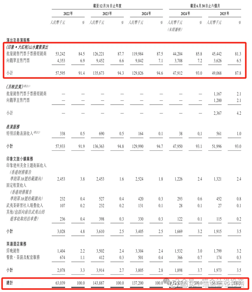 收入的绝对大头,还是严重依赖《印象·大红袍》的贡献,2025年新上的《月映武夷》还没起量,其他收入占比忽略不计了。喵老师如果中了签,吃到肉,一定去看一场《月映武夷》当做“爱的回馈”。