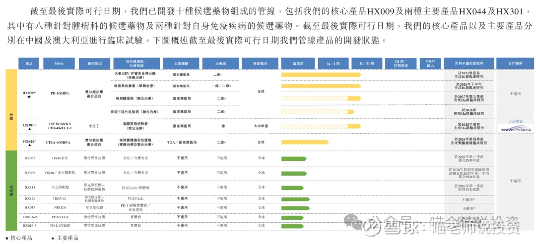 核心产品HX009为自主研发的抗PD-1/SIRPα双功能抗体融合蛋白,已完成中澳I期临床,目前在中国推进黑色素瘤、非霍奇金淋巴瘤等多项Ib至IIa期临床研究,2025年获国家药监局批准与曲妥珠单抗联合治疗晚期三阴性乳腺癌,预计2026年完成首名患者招募。HX301作为多靶点激酶抑制剂,正开展与替莫唑胺联用治疗脑胶质母细胞瘤的II期临床;HX044为抗CTLA-4/SIRPα融合蛋白,在中澳同步推进晚期实体瘤I/IIa期研究。此外,公司曾开发靶向PD-1的单克隆抗体HX008,转让后于2022年实现商业化。