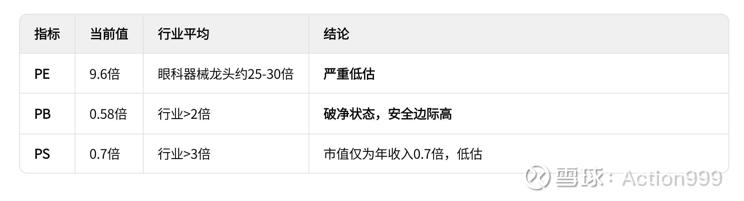 公司当前被显著低估(PB 0.58/PE 9.6/PEG0.32),但依托研发转化效率+全产业链布局+政策红利,具备5-10倍市值增长潜力,是港股稀缺的高成长眼科器械龙头。