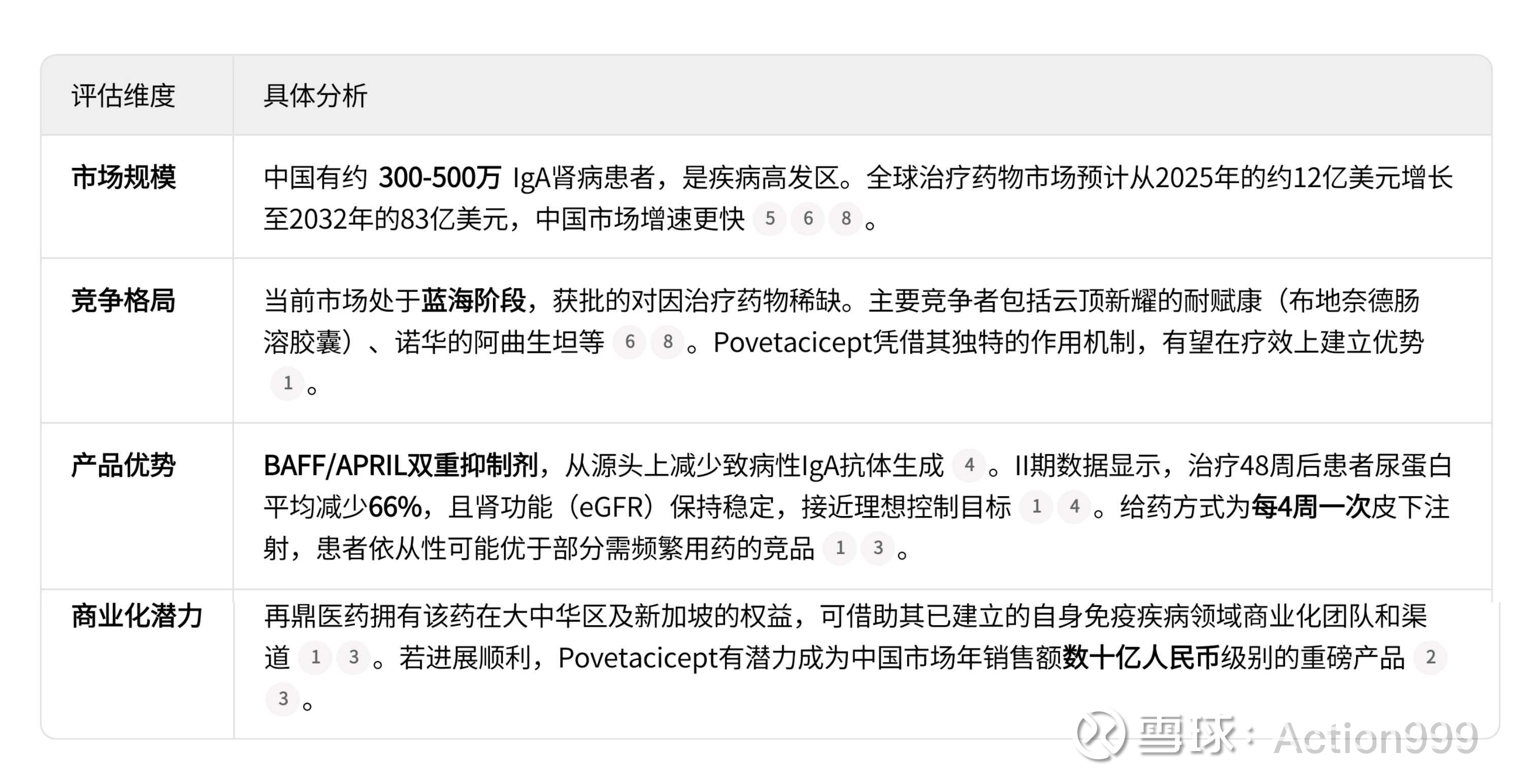 市场竞争态势:虽然市场前景广阔,但竞争也在加剧。除了已上市的药物,荣昌生物的泰它西普(同类靶点药物)用于治疗IgA肾病的III期临床也已达到主要终点,预计将提交上市申请。未来Povetacicept需要在疗效、安全性和给药便利性上建立起足够差异化的优势。
