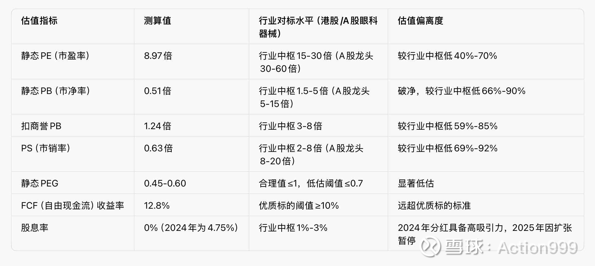 公司当前估值处于港股医疗器械板块、全球眼科器械赛道的绝对底部区间,即使对比港股低估值的传统制造业,估值仍具备显著优势;