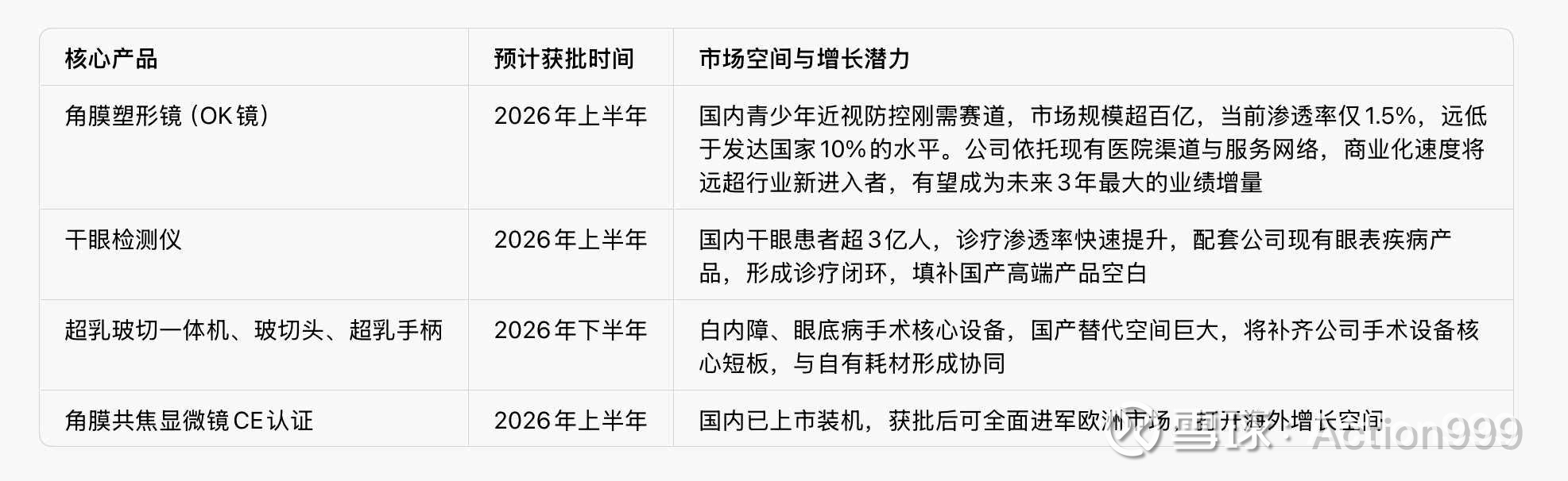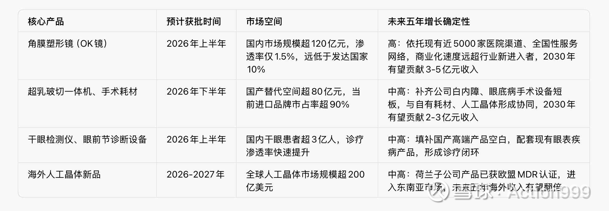 核心管线储备丰富,OK镜、超乳玻切一体机、高端人工晶体等重磅产品即将落地,覆盖眼科最具增长潜力的细分赛道,为长期增长提供充足动力。