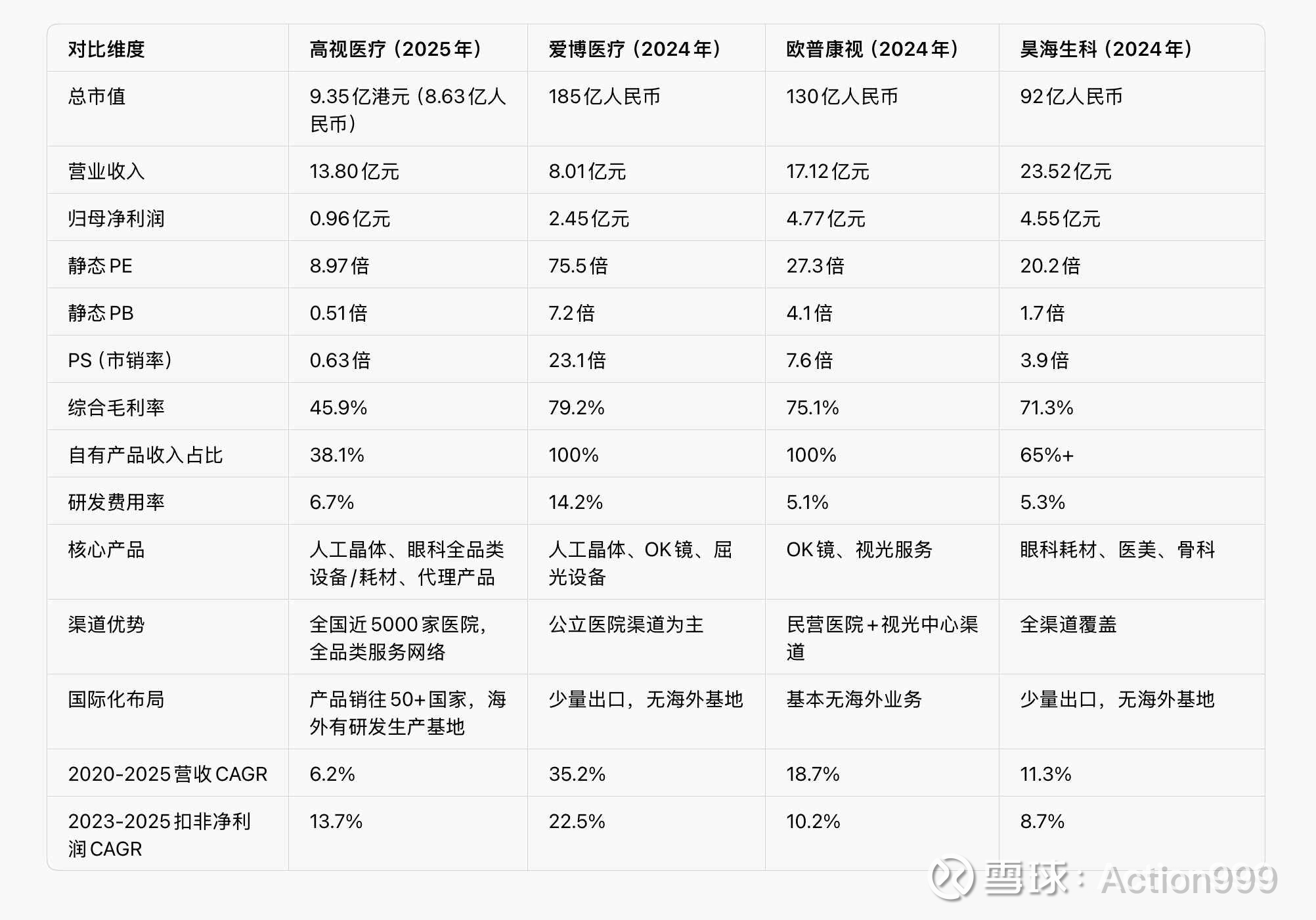 选取A股眼科器械三大龙头(爱博医疗、欧普康视、昊海生科),从规模、盈利、估值、竞争力等维度进行深度对比,清晰定位高视医疗的优势与短板: