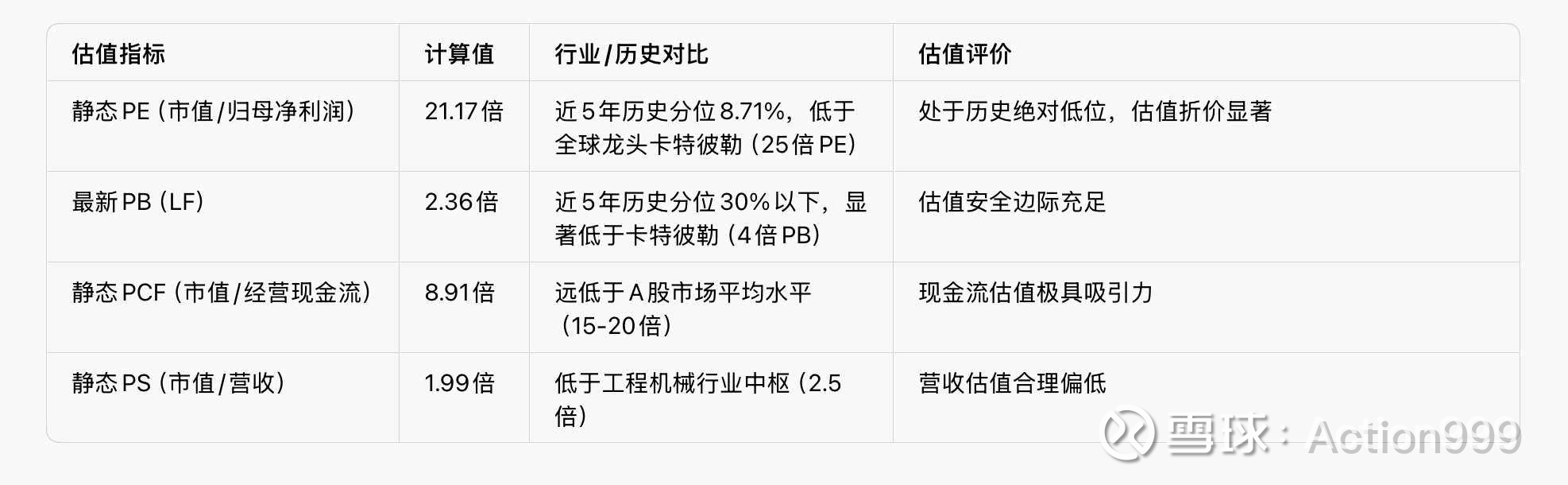 相对全球龙头:成长速度远超卡特彼勒(未来3年净利润复合增速是卡特彼勒的2倍以上),但PE折价15%,PB折价42%,估值折价显著;